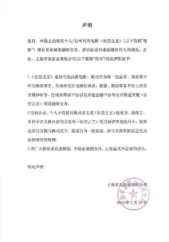 搜狐娱乐消息,2月24日,电影《长空之王》发布声明,称从未亦无计划通过各平台上的官方媒体帐号、任何众筹类平台以及其他金融平台等公开渠道开展《长空之王》项目融资业务。任何企业、个人不得冒用名义擅自进行并发布《长空之王》项目融资等违法行为。