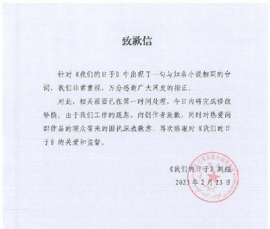 原标题:《我们的日子》台词抄袭《天官赐福》惹争议 剧方发致歉声明